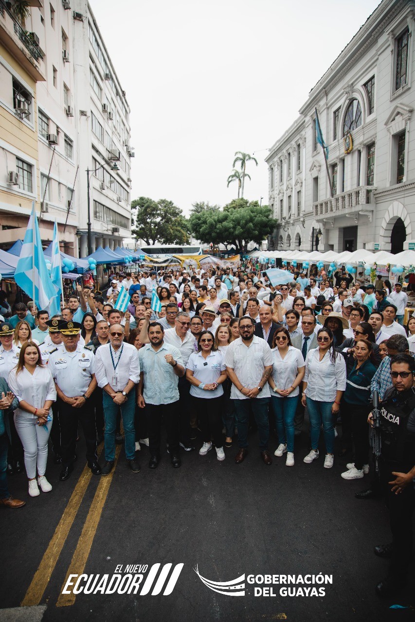La caminata arrancó en el Parque Centenario y recorrió el corazón de Guayaquil hasta llegar a la Plaza de la Administración, donde la máxima autoridad de la provincia saludó con calidez a los asistentes, destacando la fuerza colectiva que impulsa a Guayaquil hacia adelante.