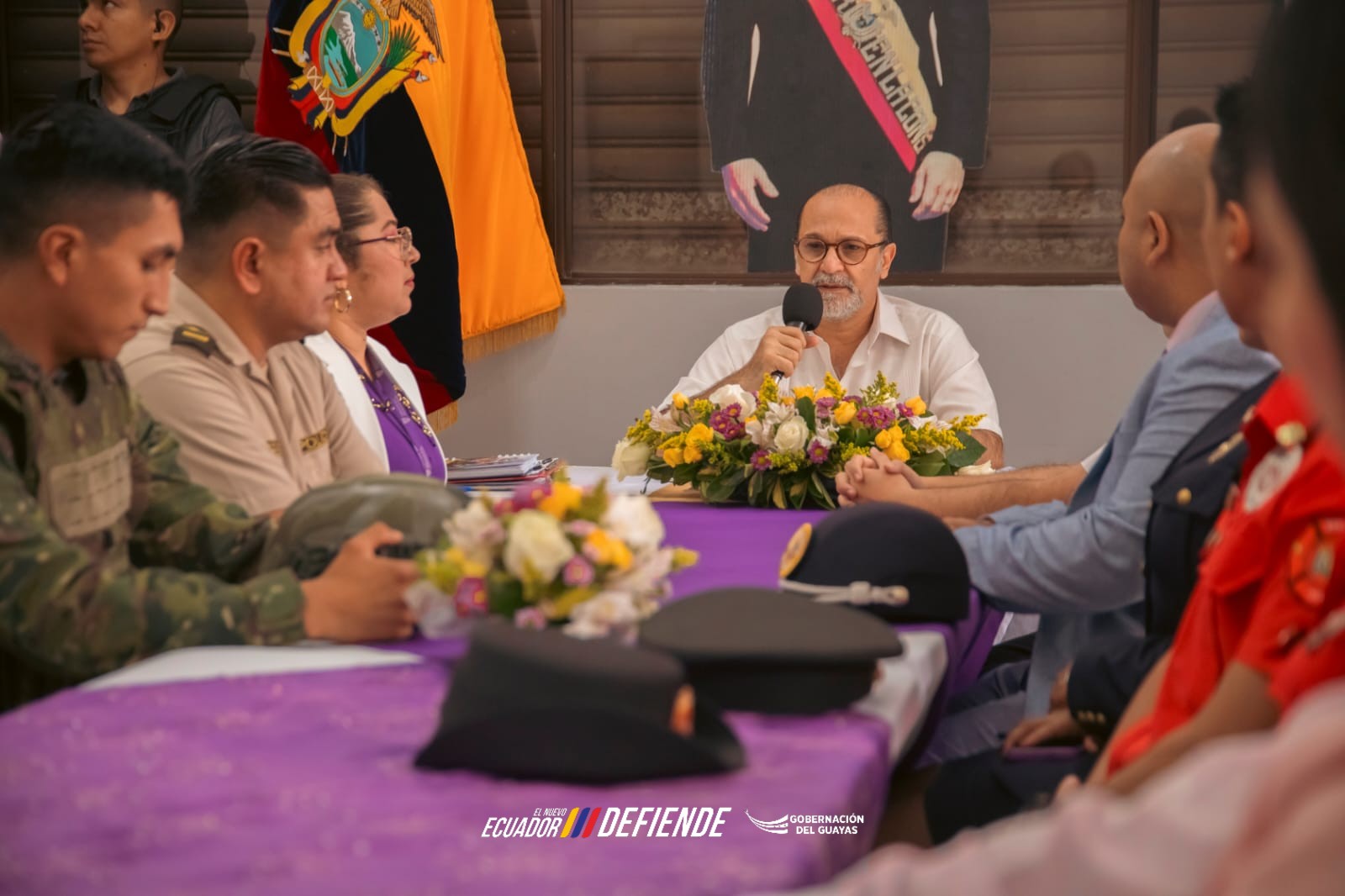 Guayas, 23 de octubre de 2025.- Los avances en materia de seguridad fueron presentados durante la Mesa de Seguridad presidida por el gobernador del Guayas, Humberto Plaza, junto a la jefa política Leonela Ochoa y representantes de la Policía Nacional, Fuerzas Armadas, CTE, Cuerpo de Bomberos y Ministerio de Educación.